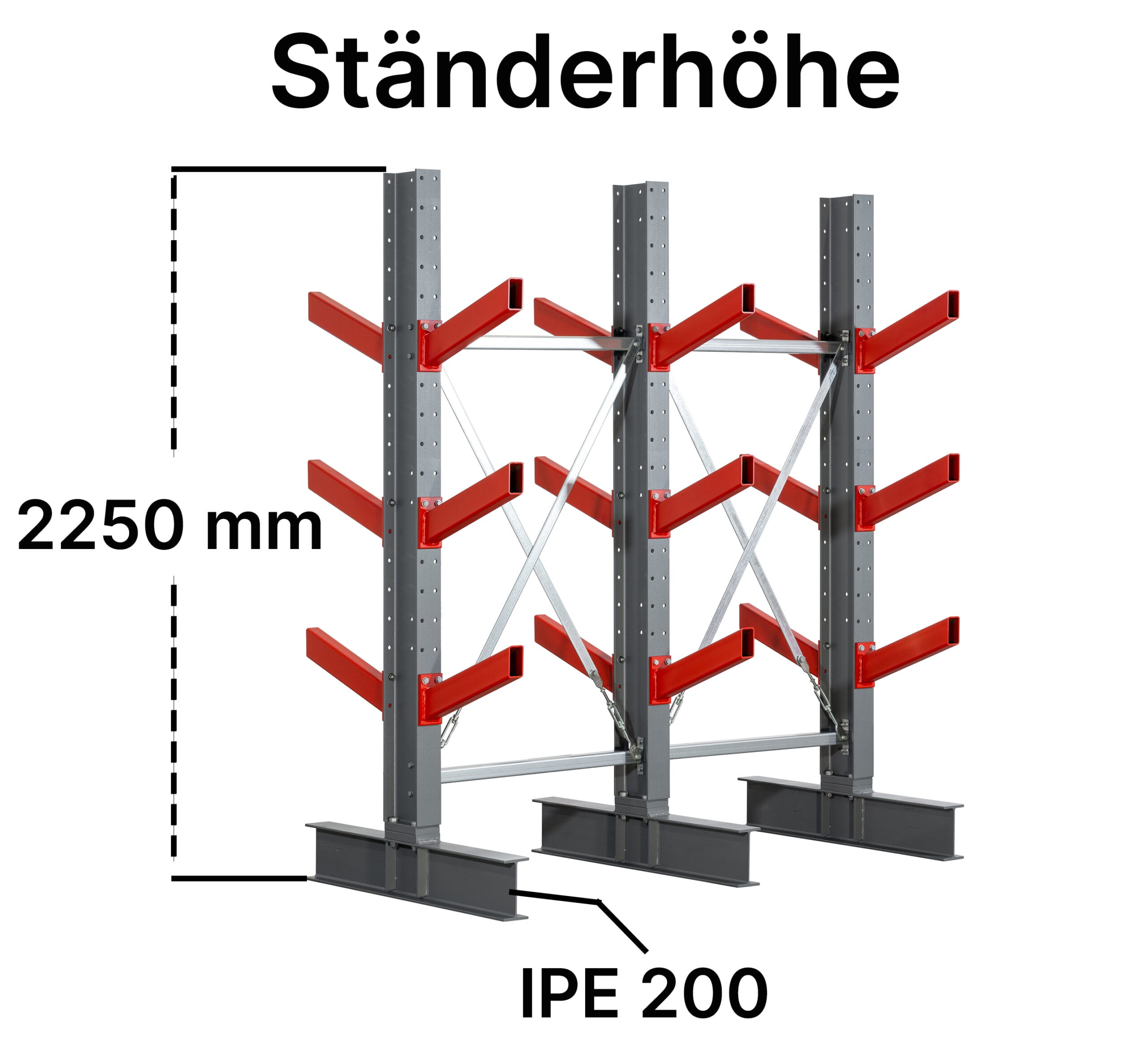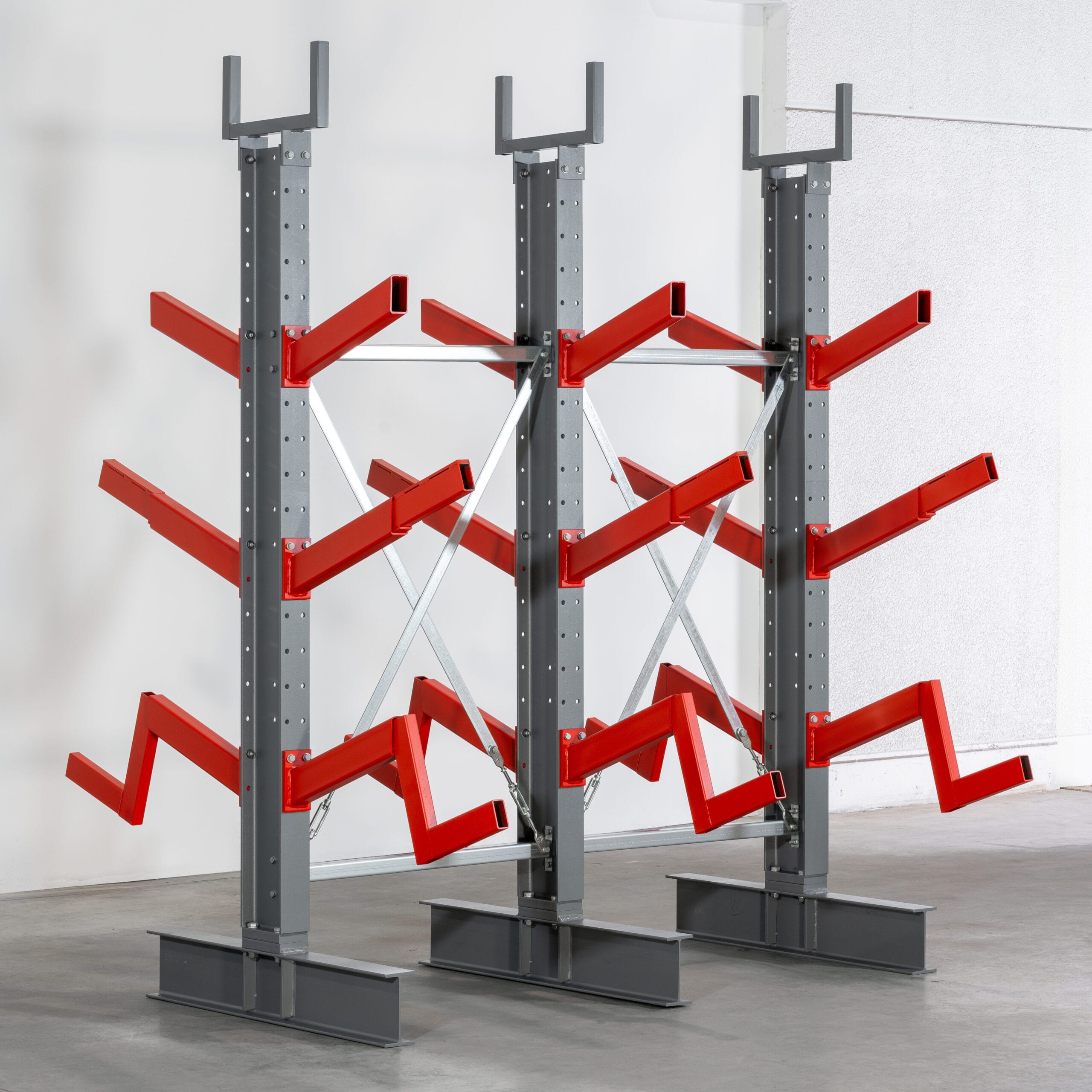 Unser Schrägarmregal ist die perfekte Lösung für die sichere Lagerung von langen, runden oder sperrigen Gütern. Dazu zählen beispielsweise Rohre, Balken, Holzlatten oder Stangen. Die Schrägarme sind in einem 20° Winkel angebracht, um das Wegrollen oder Herunterfallen der Lagerwaren zu verhindern. Das Schrägarmregal verfügt über dieselbe Basis wie das handbediente Kragarmregal, allerdings ist es nur in zweiseitiger Ausführung erhältlich. Dadurch bietet die robuste Konstruktion eine Traglast von bis zu 3000 kg pro Seite bei einer Armlänge von 500 mm.